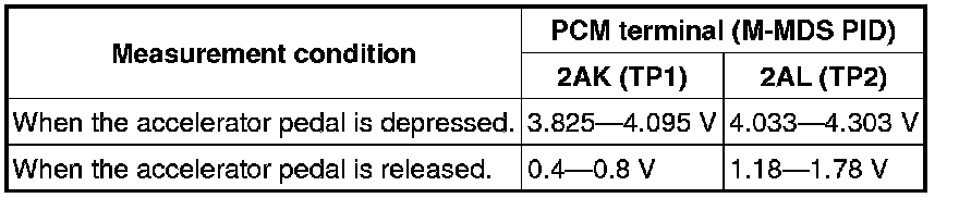 2. Verify that the voltage at PCM terminals 2AK (M-MDS PID: TP1) and 2AL (M-MDS PID: TP2) increases while gradually increasing the accelerator pedal opening angle according to the accelerator pedal opening angle.