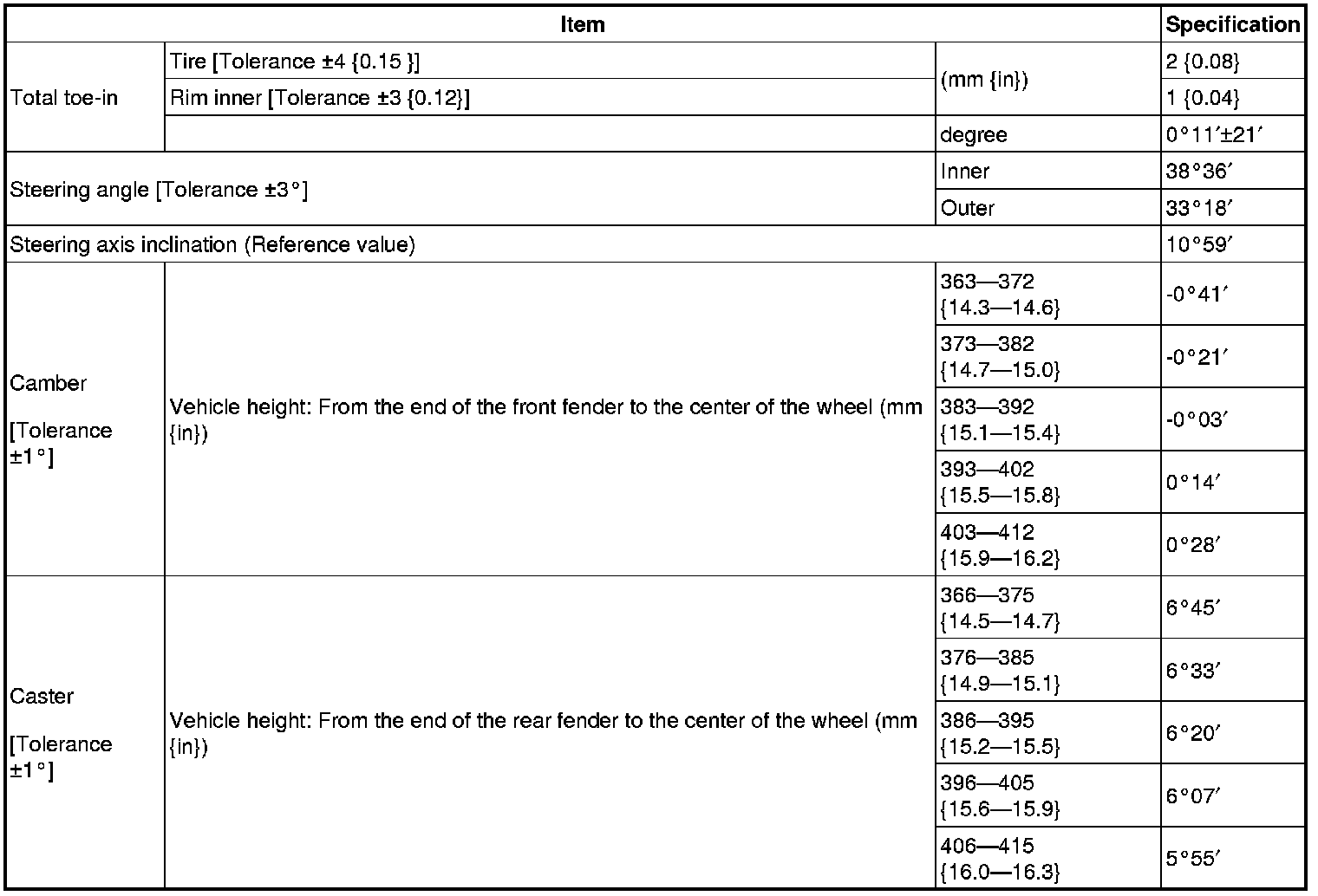 - Difference between the left and right dimension for camber and caster is within 1°.
