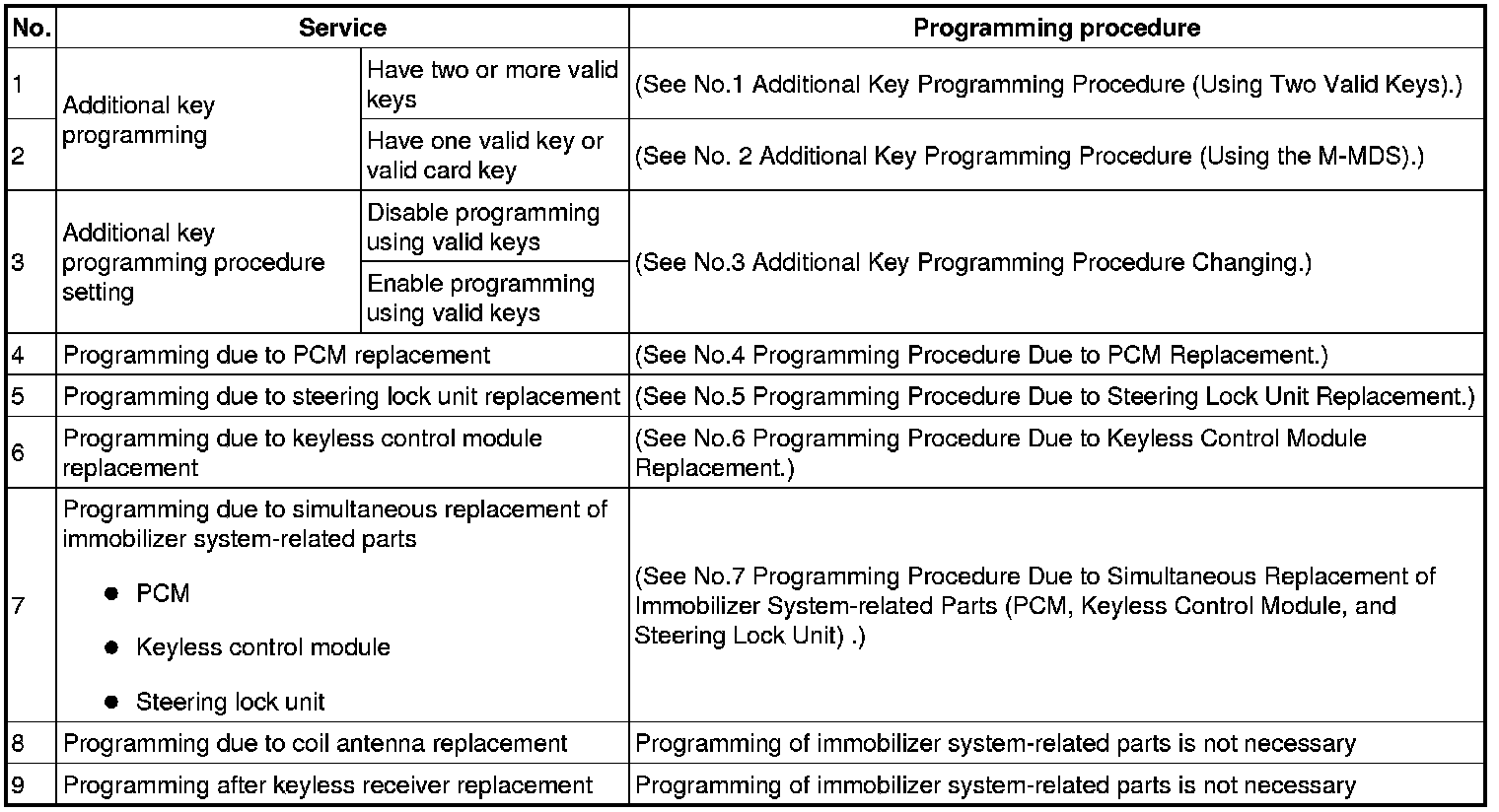 Immobilizer System-Related Parts Service and Programming Procedure Table