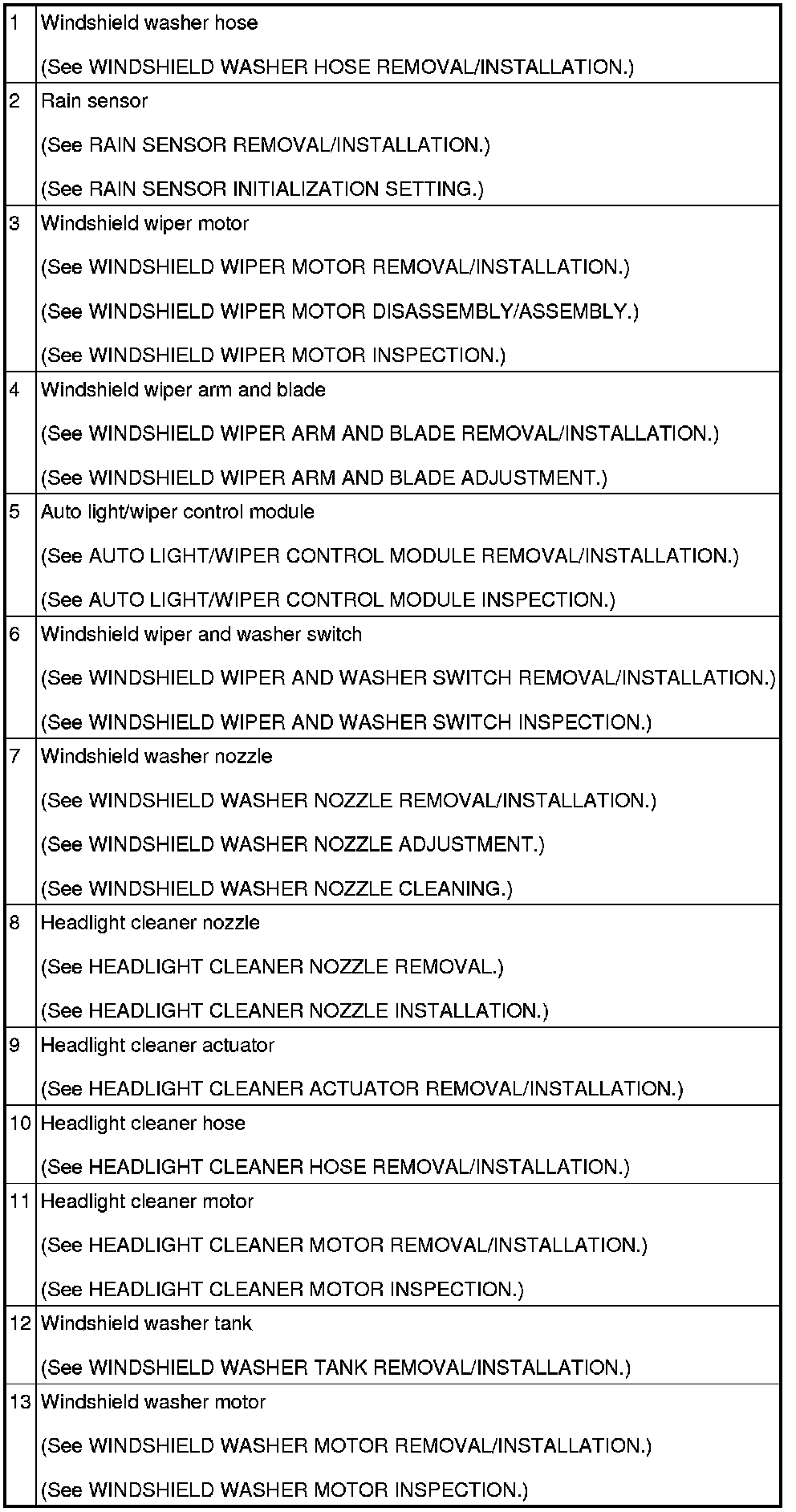 WIPER/WASHER SYSTEM LOCATION INDEX