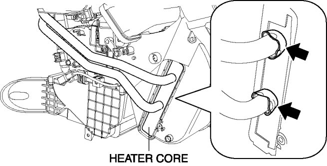 - When removing or installing the heater core, hold the heater core side of the pipe connecting area. Holding the pipe side may cause a bend on the crimped area of the pipe connecting area, resulting in heater core damage.