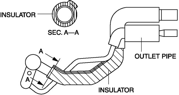 3. Roll the adhesive polyurethane (1) on to the outlet pipe so that the adhesive polyurethane (1) notch reaches the contact point between the outlet pipe sponge rubber and the insulator.