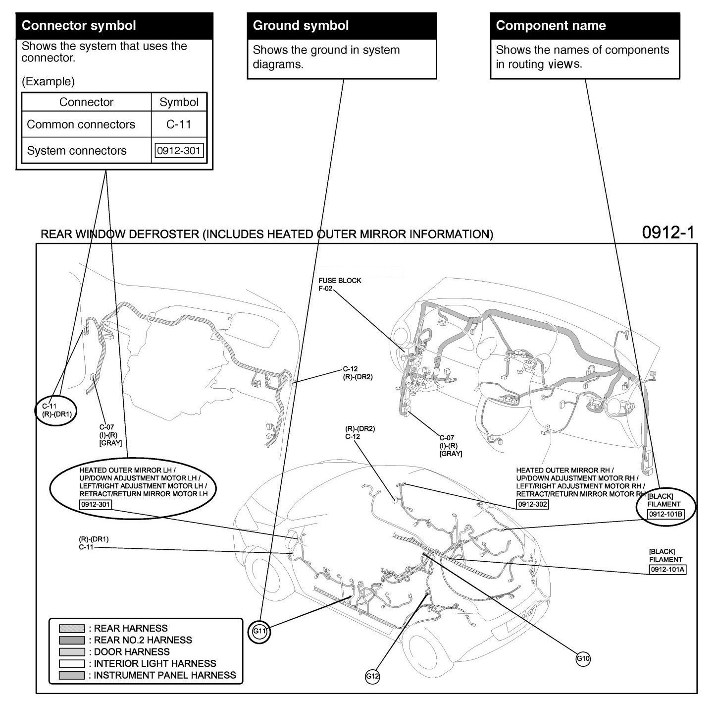 The routing view shows where electrical components are on the system circuit diagram by call out line and connector symbols.