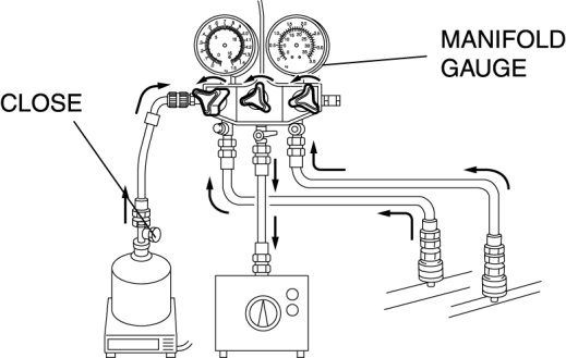 - Close the manifold gauge valve immediately after stopping the vacuum pump. If the valve is left open, the vacuum pump oil will back flow into the refrigeration cycle and cause a decrease in the efficiency of the air conditioner.