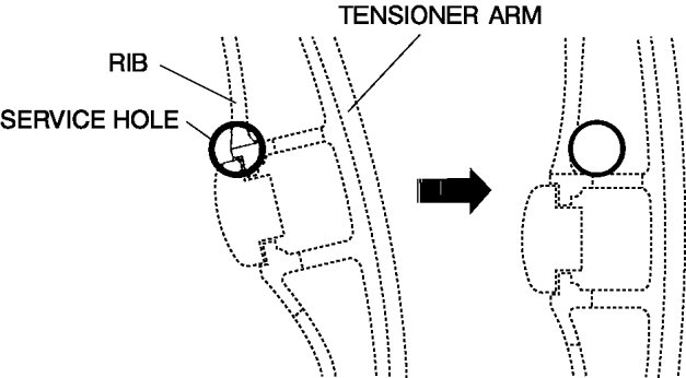 b. Rotate the M6 bolt installed to the front cover by hand and insert it to the position where it catches the inside of the rib on the tensioner arm.