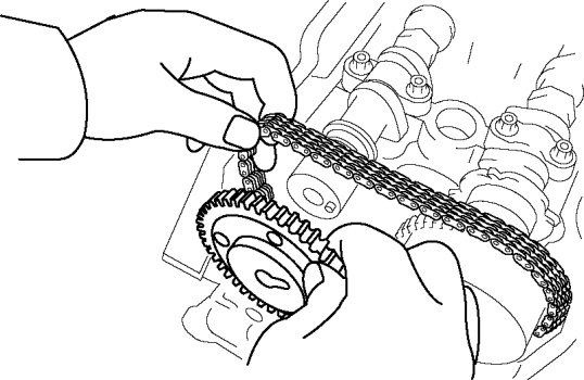 25. Verify that there is no slack in the timing chain, and then verify that the marks on the camshaft sprocket and the crank pulley are aligned.