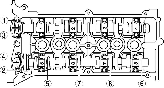 13. Loosen the camshaft cap installation bolts in two or three steps in the order shown in the figure, and remove the camshaft caps.