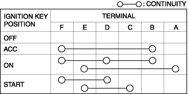 4. Verify that the continuity between the ignition switch terminals is as indicated in the table.