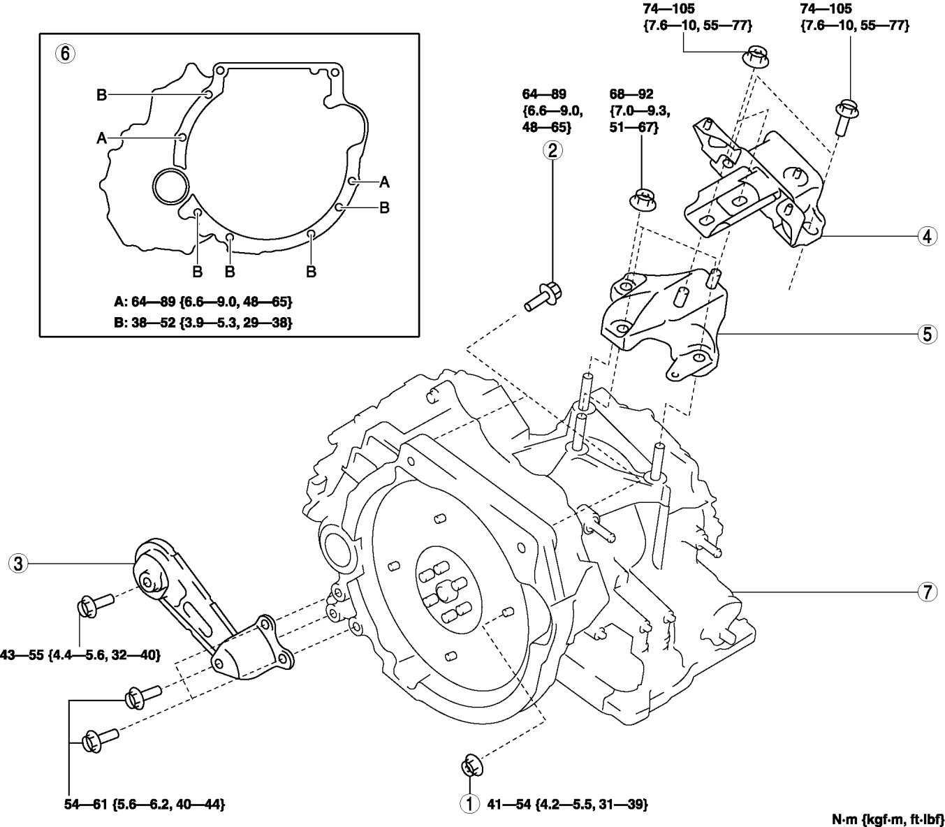- A, B:54-61 Nm {5.5-6.2 kgf-m, 40-44 ft-lbf}