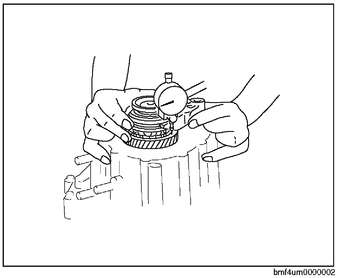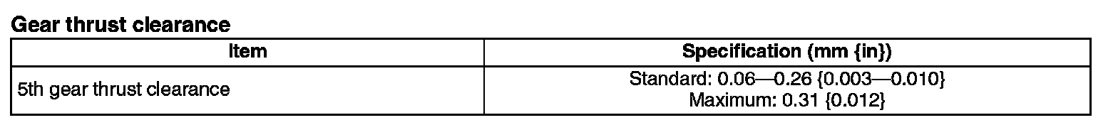 - If it exceeds the maximum specification, inspect the contact surfaces of 5th gear and the clutch hub. Replace worn or damaged parts.