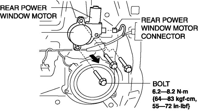 5. Disconnect the rear power window motor connector, remove the bolt, then remove the power window motor from the power window regulator drum.