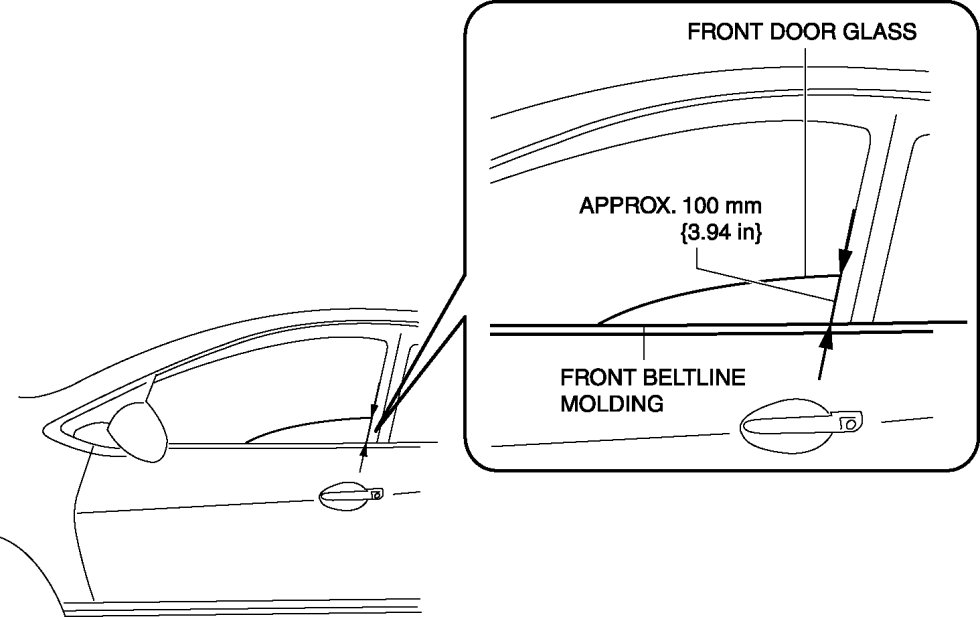 1. To access the glass installation bolt, adjust the position of the front door glass so that the height of the front door glass towards the rear is approx. 100 mm {3.94 in}.