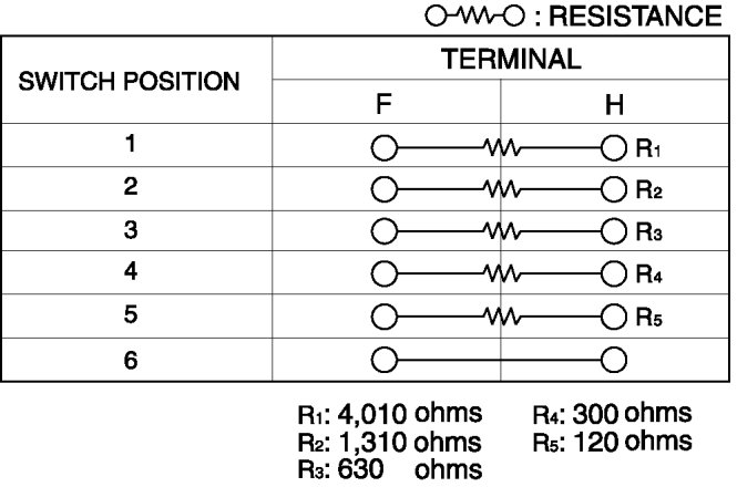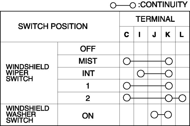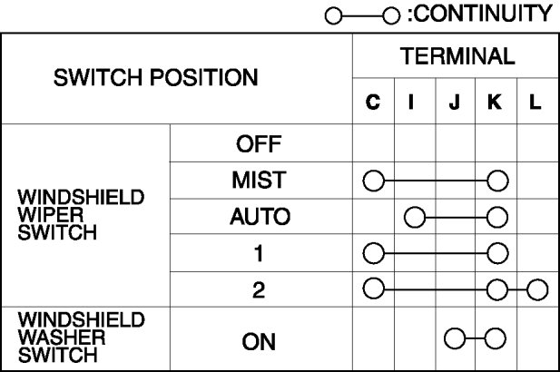 4. Verify that the resistance and continuity between the windshield wiper and washer switch terminals as indicated in the table.