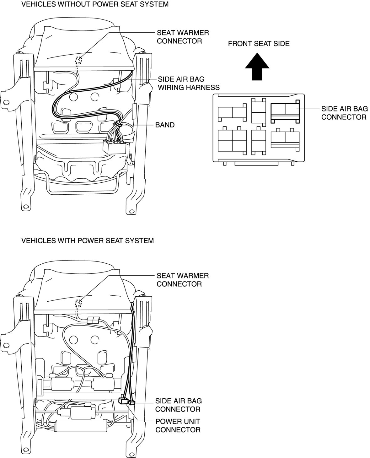 7. Disconnect the side air bag connector and seat warmer connector (Vehicles with power seat system).