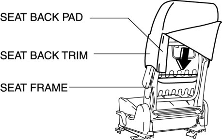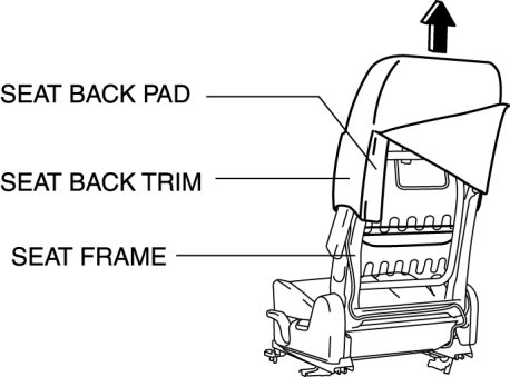14. Remove the seat back trim and the seat back pad as a single unit from the seat frame by pulling them in the direction of the arrow.