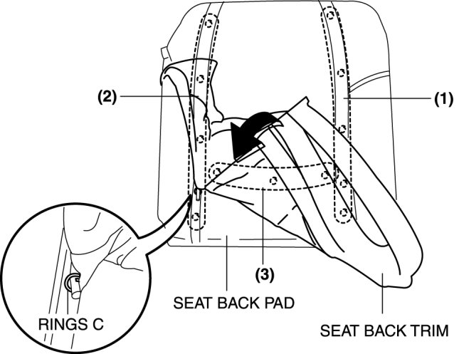1. Install the seat back trim to the front seat back pad, install the rings C in the order of (1), (2), (3) shown in the figure, then install the seat back trim.