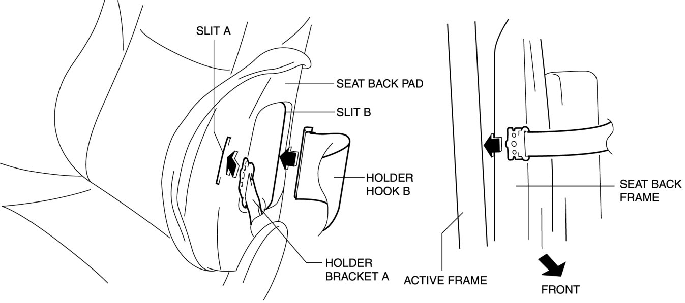 3. Pass holder bracket A through slit A, holder hook B through slit B of the seat back pad.