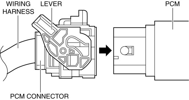 1. Verify that the PCM connector lever is tilted towards the wiring harness side as shown in the figure.