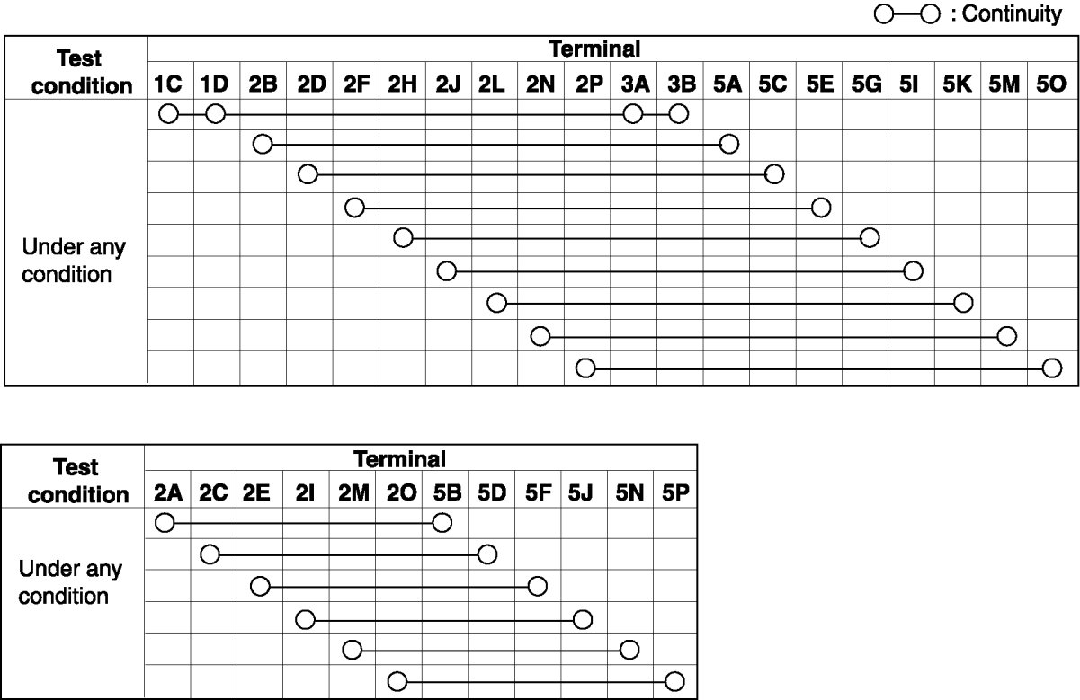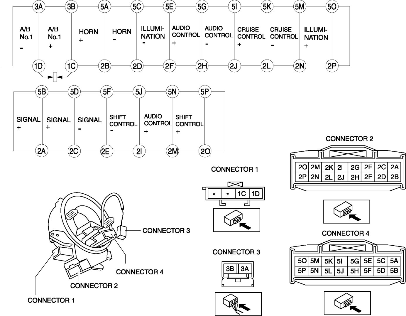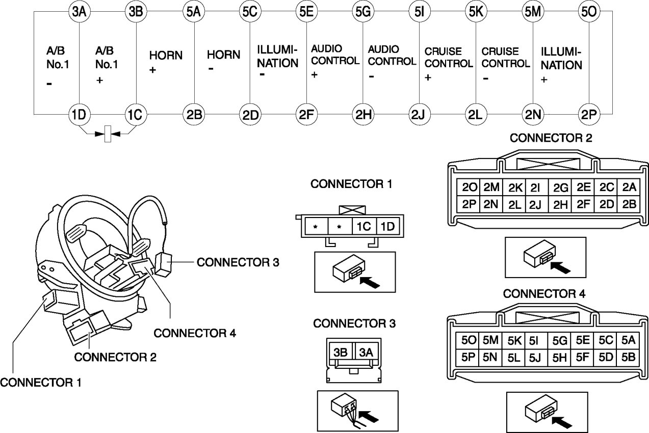 - When the vehicle-side connector for the clock spring is disconnected, terminals 1C and 1D are shorted to prevent unexpected operation (deployment) of the air bag module.