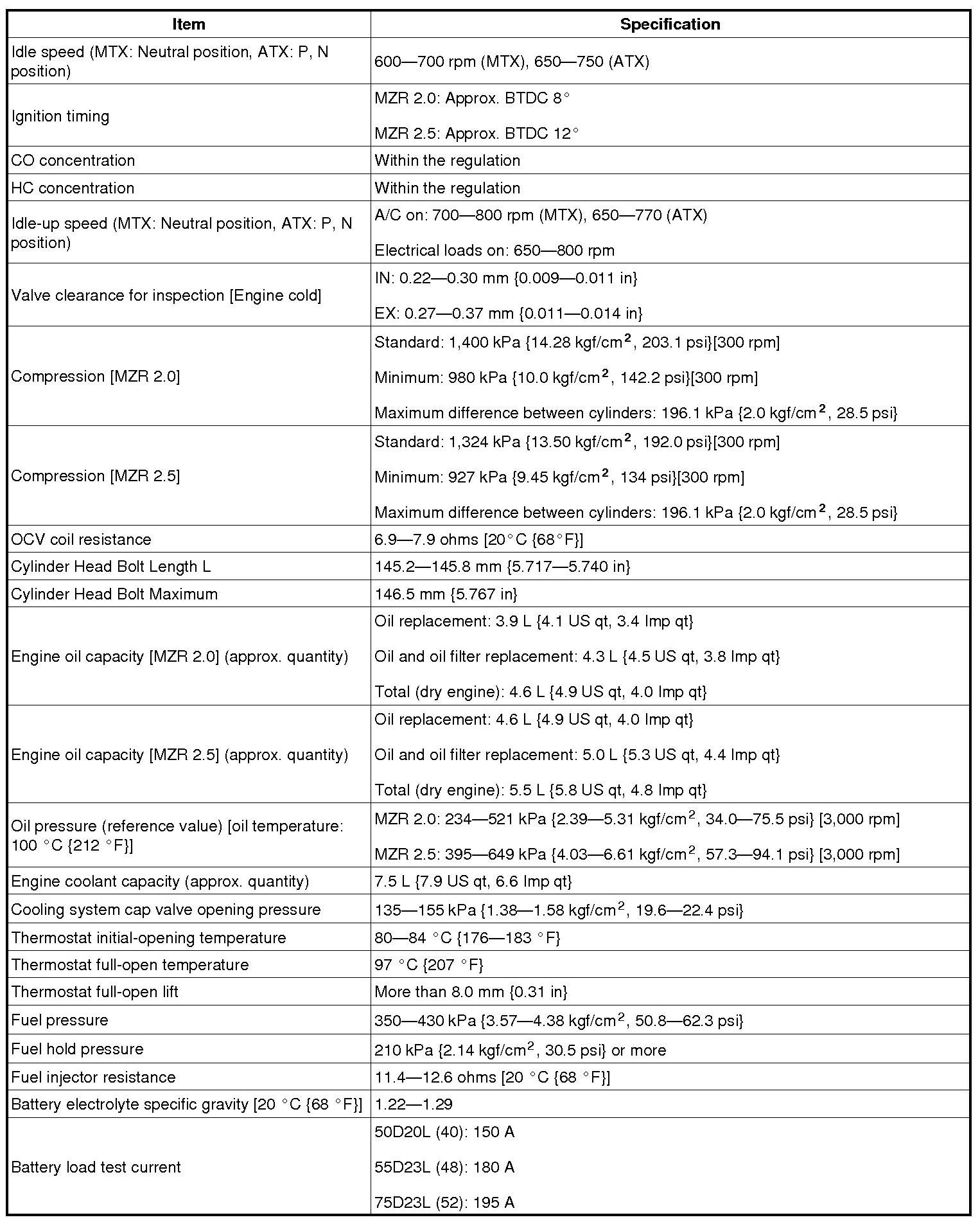 ENGINE TECHNICAL DATA [MZR 2.0, MZR 2.5]