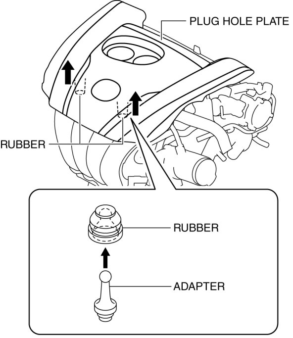 3. Press the front of the plug hole plate in the direction of the arrow with both hands to insert the rubber to the adapter on the engine side.