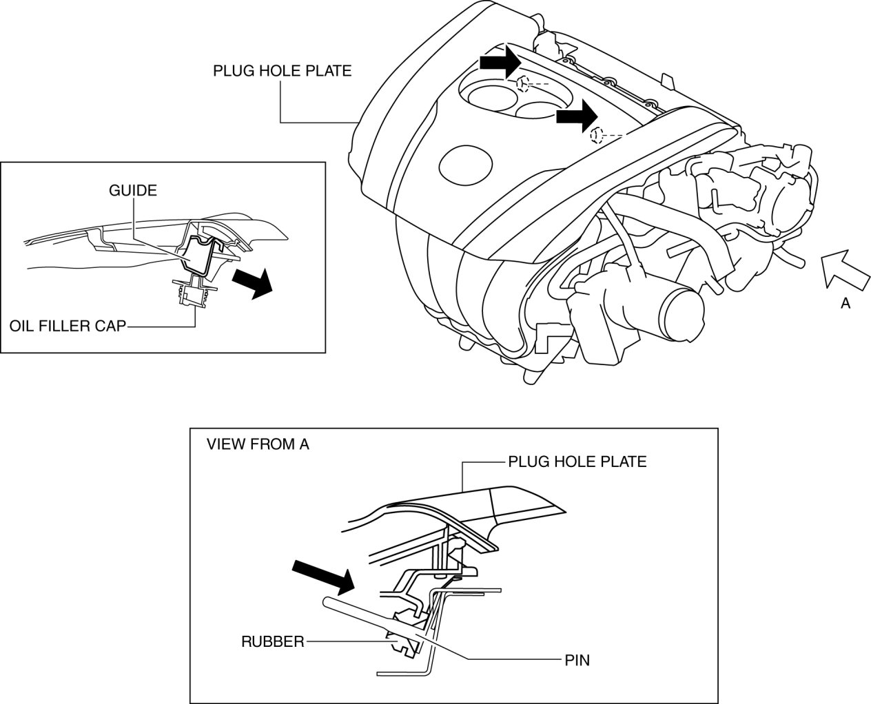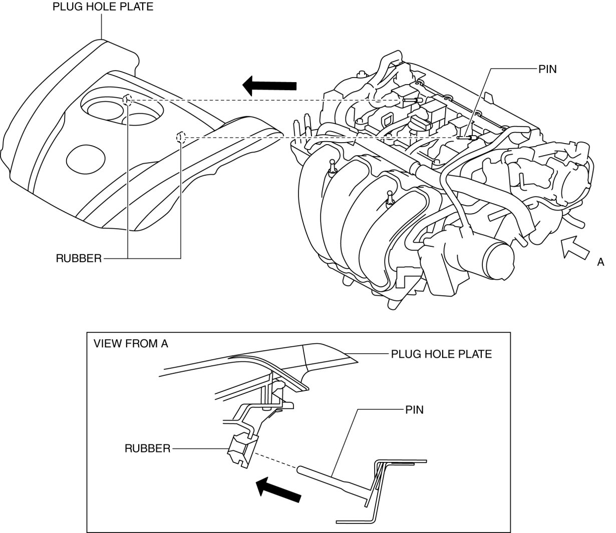 2. Pull out the plug hole plate from the pin on the engine side in the direction of the arrow and remove the plug hole plate.