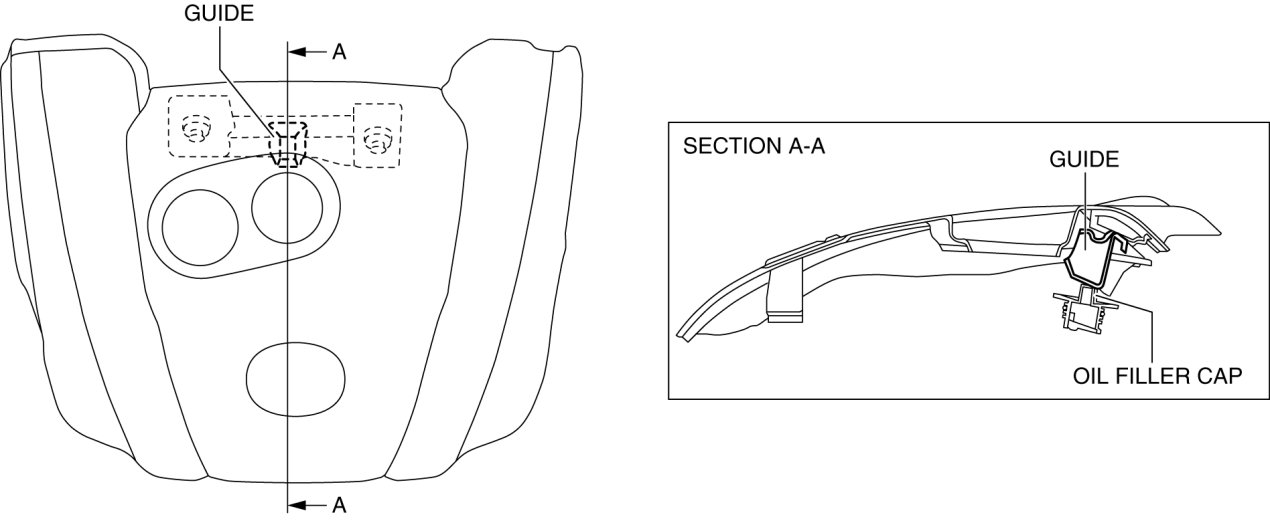 2. Press the guide in the direction of the arrow with the guide placed along the oil filler cap, and insert the rubber until it contacts the pin on the engine side.