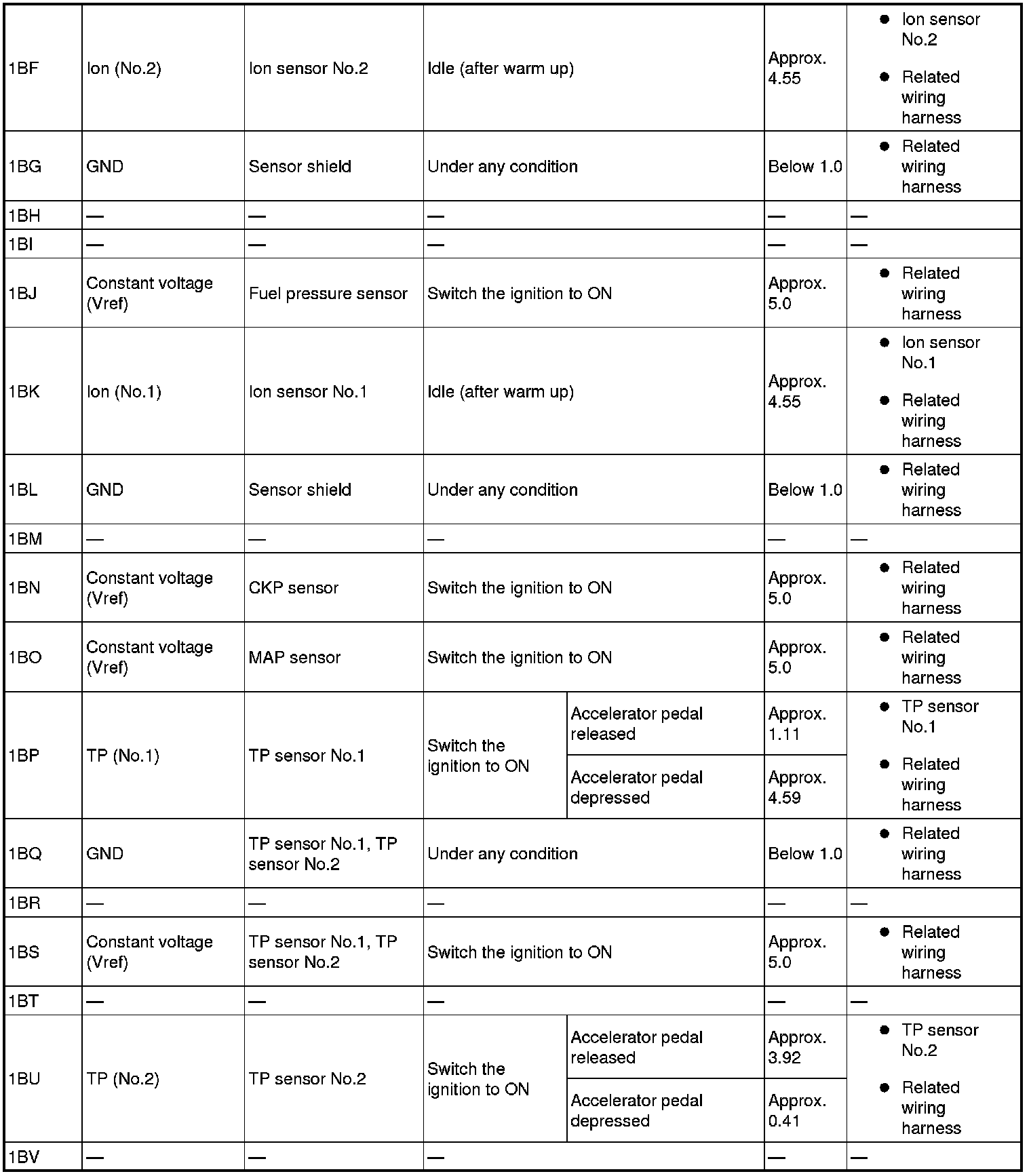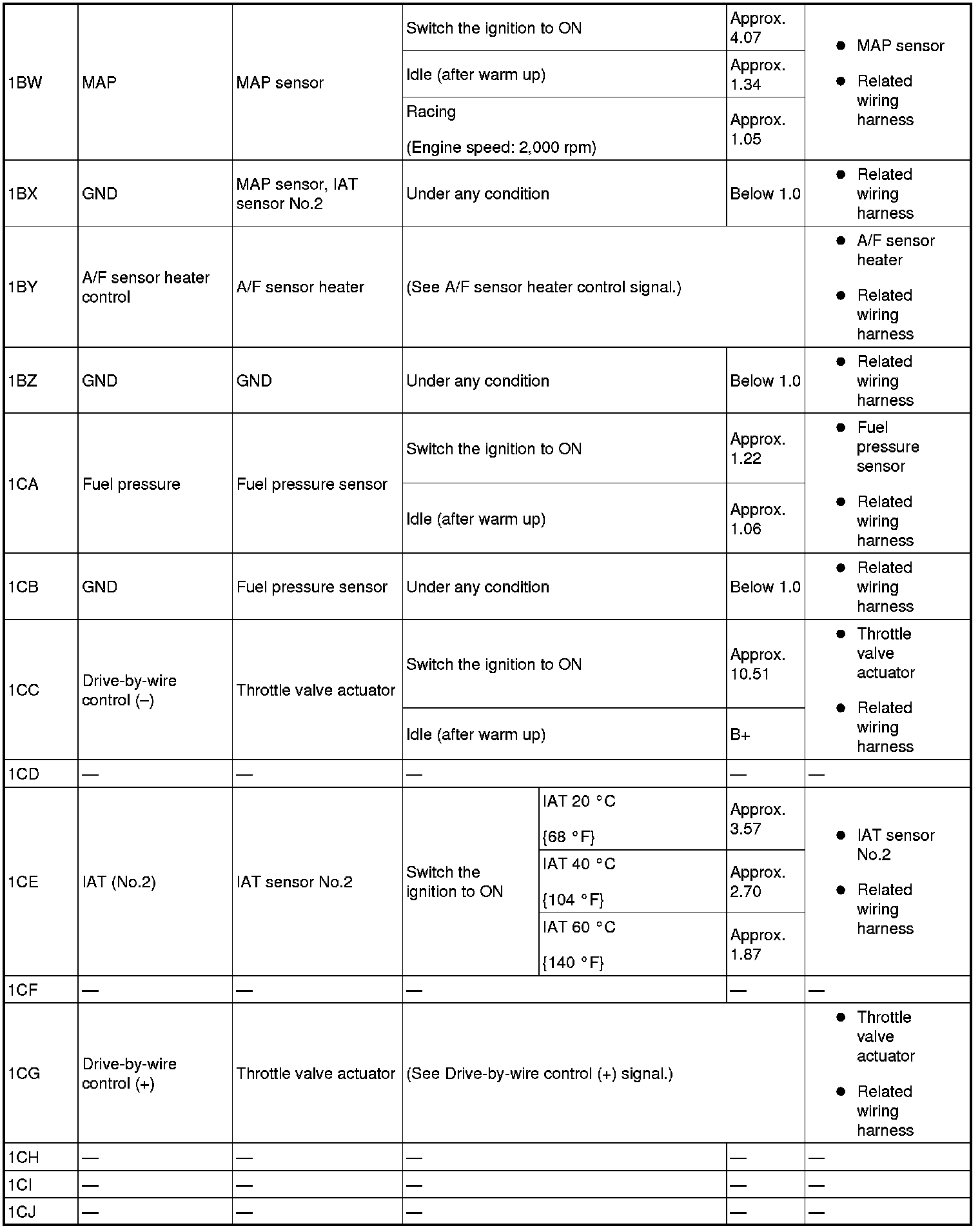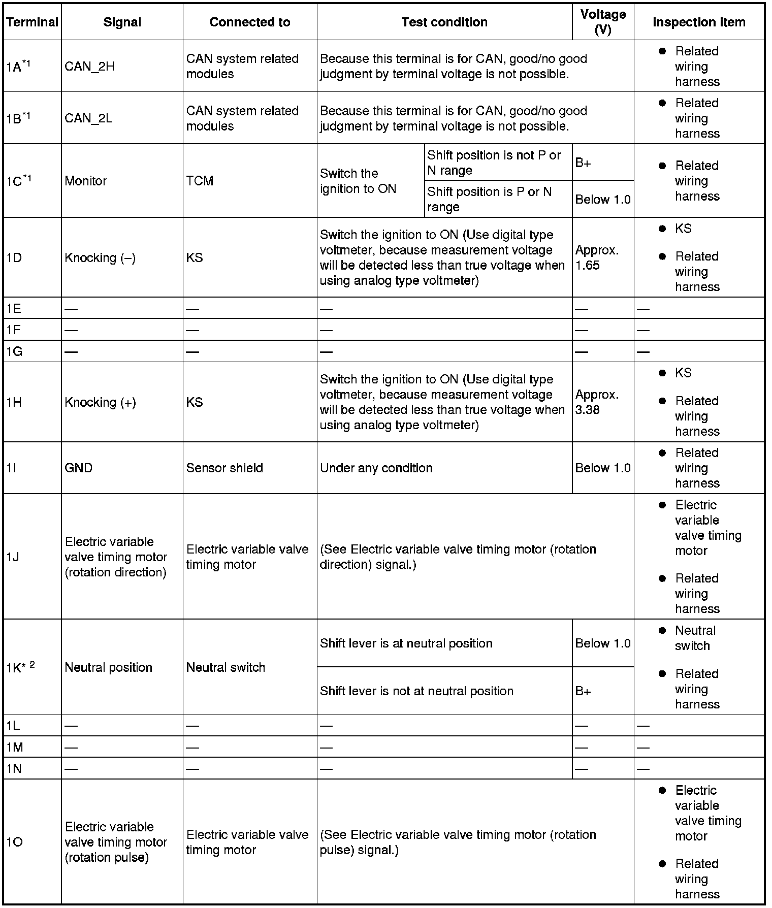 - Because the PCM uses a waterproof connector, the inspection for the voltage/wave pattern cannot be performed. The following values are for reference.