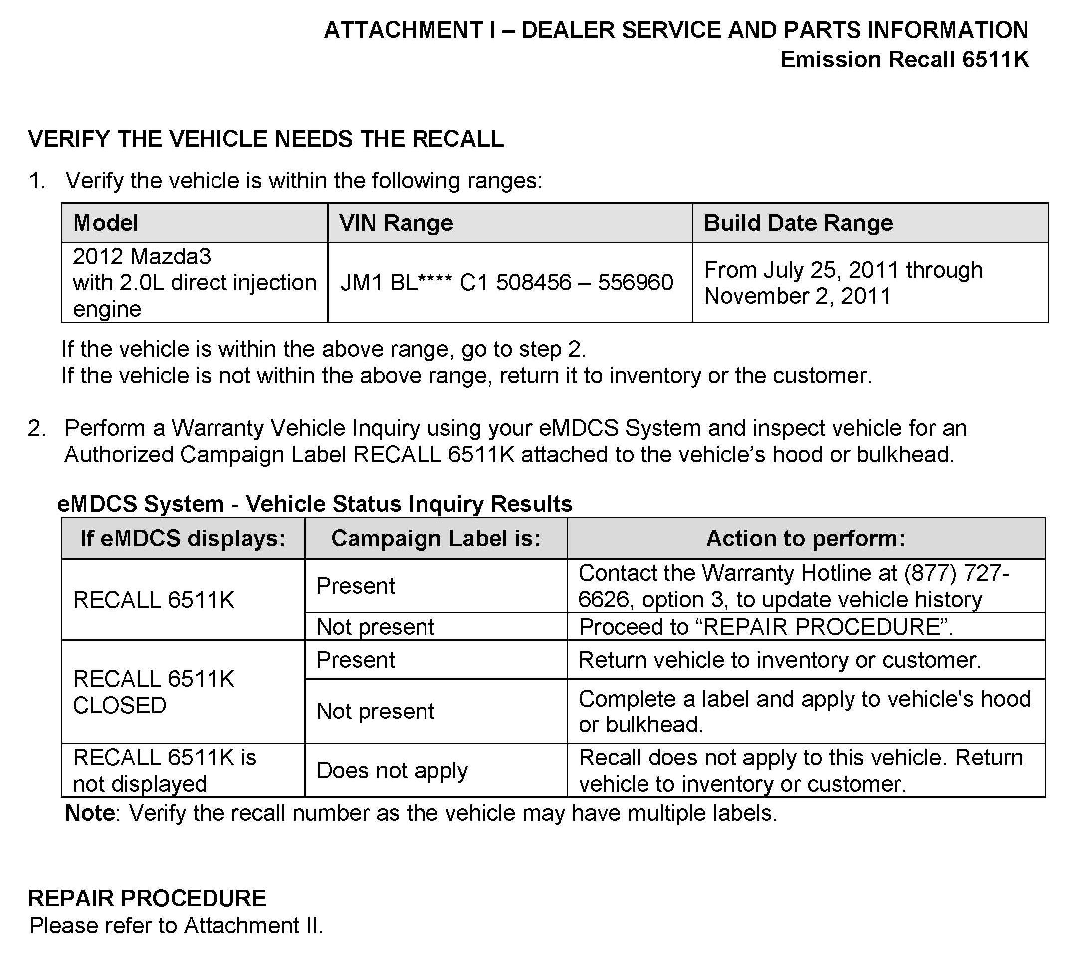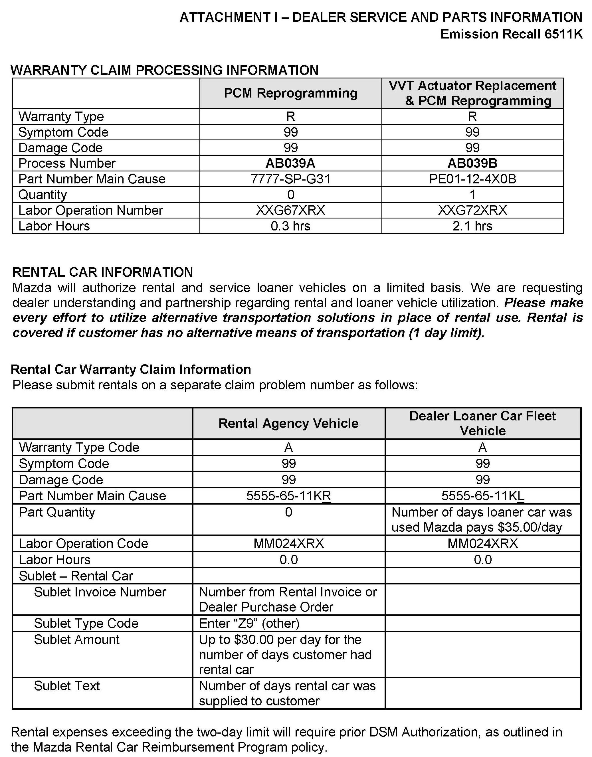 Attachment I - Dealer Service and Parts Information