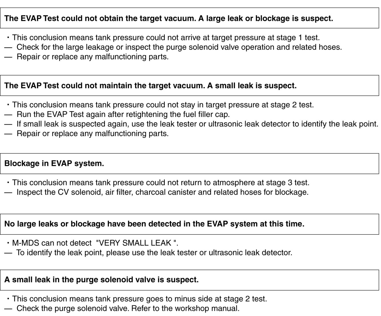 - The EVAP system test, which can be substituted for the run drive cycle as an EVAP control system repair confirmation method, can detect the small/large leak or blockage without run-drive cycle.