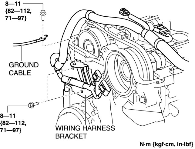 Install the ground cable and wiring harness bracket shown in the figure.