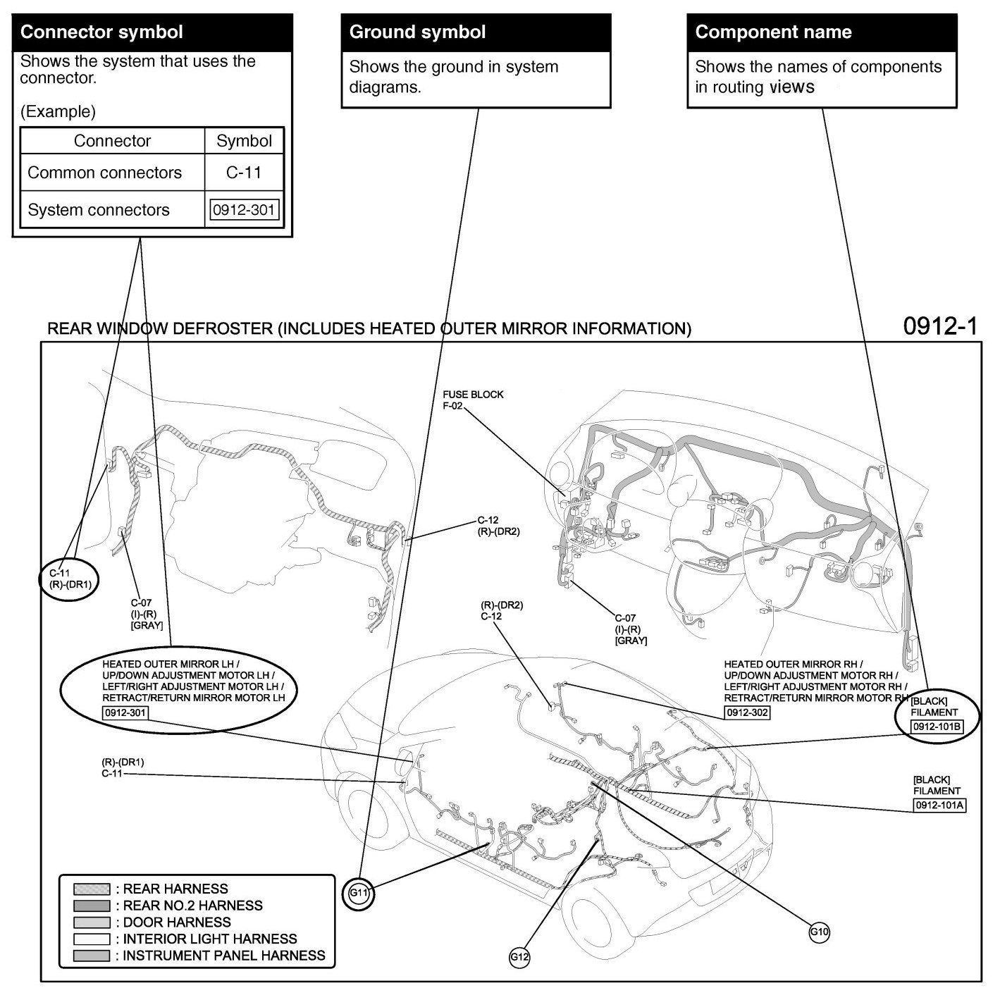 The routing view shows where electrical components are on the system circuit diagram by call out line and connector symbols.