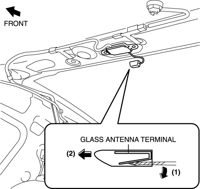1. Remove the connector B in the direction of the arrow (2) shown in the figure while pressing the glass antenna terminal in the direction of the arrow (1).
