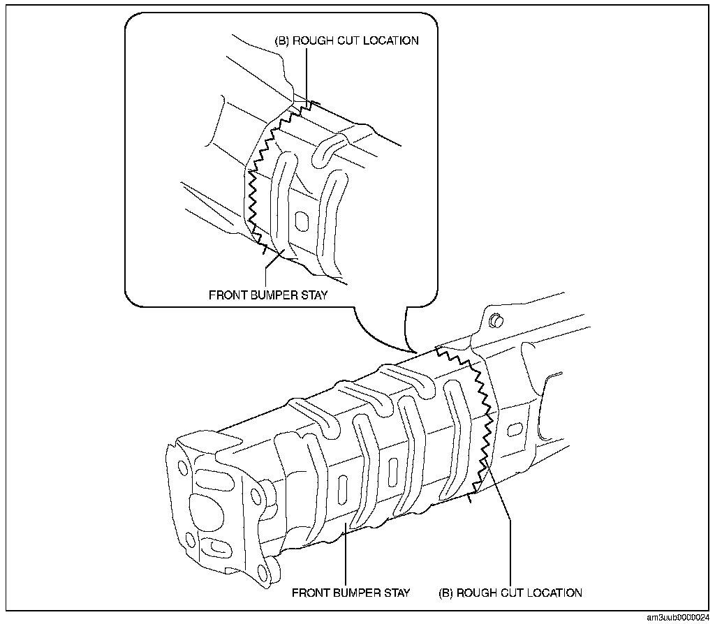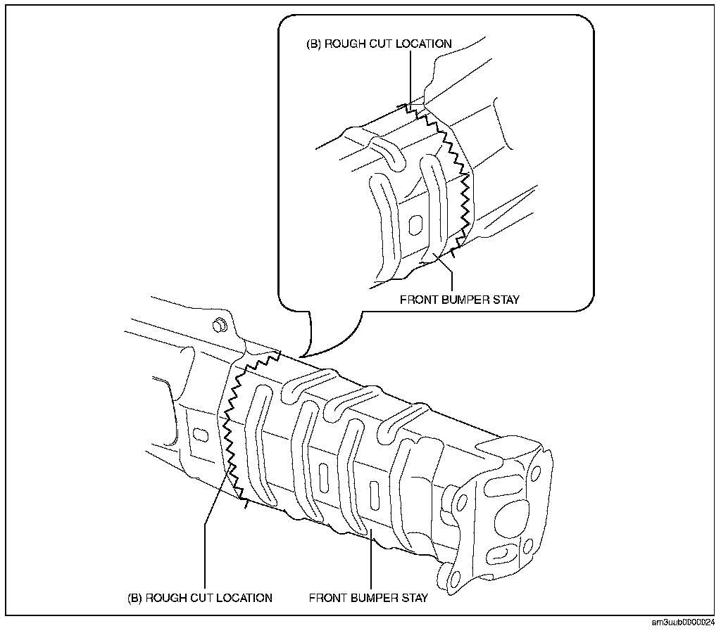 3. Rough cut area locations indicated by (B) shown in the figure while remove the front bumper stay.