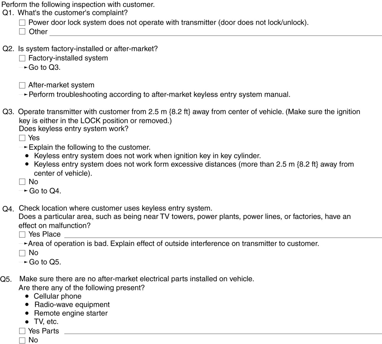 - If the symptom is "Power door lock system does not operate with transmitter at all," find out how the customer uses the keyless entry system by following the check sheet below.