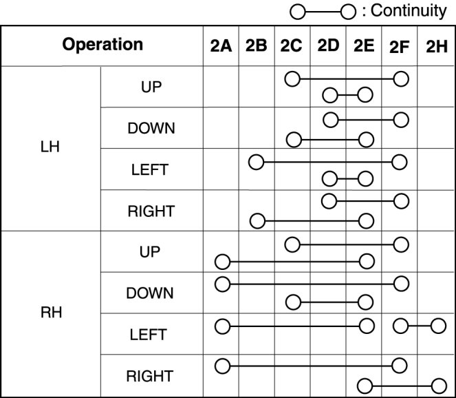 3. Verify that the continuity between the power outer mirror switch terminals is as indicated in the table.