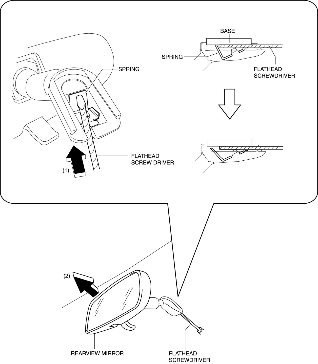 1. Insert a tape-wrapped flathead screwdriver to the position shown in the figure and press the center part of the spring in the direction of arrows (1), and then pull out the rearview mirror in the direction of arrows (2) shown in the figure.