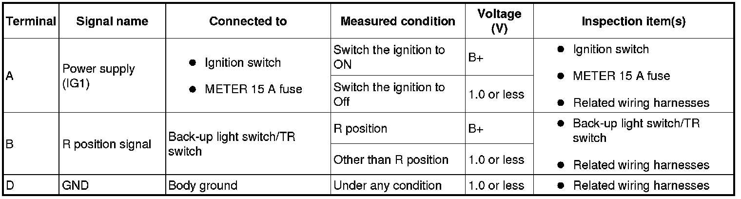 - If the voltage is not as specified in the Terminal Voltage Table (Reference), inspect the parts under "Inspection item (s)" and related wiring harnesses.