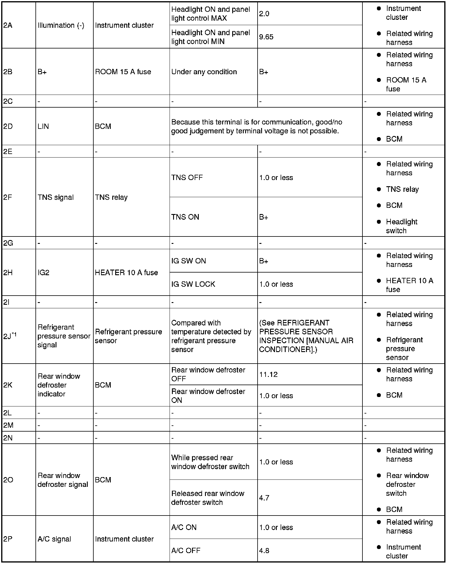 4. By inserting the positive (+) lead of the tester into the climate control unit connector, measure the voltage according to the terminal voltage table.