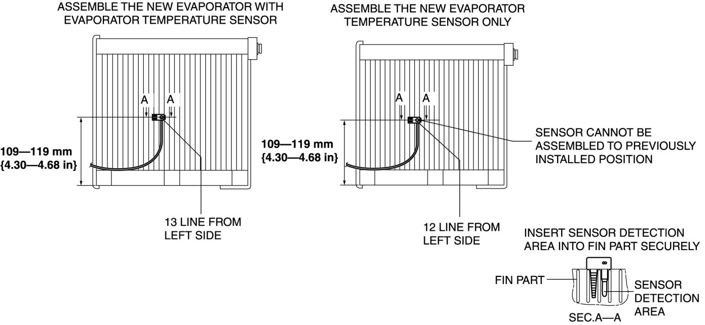 - When installing the evaporator temperature sensor without replacing the evaporator, assemble the evaporator temperature sensor with the installation position slid to the left of the previous position by 1 line. If the evaporator temperature sensor is assembled to the previously installed position, it may not function due to poor contact of the fin surface with the sensor detection area caused by fin deformation.