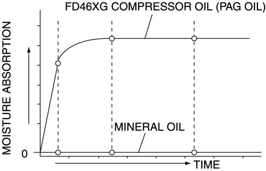 - FD46XG compressor oil (PAG oil) has a higher moisture absorption efficiency than the previously used mineral oil. If moisture mixes with the compressor oil, the refrigerant system could be damaged. Therefore, install caps immediately after using the compressor oil or removing refrigerant system parts to prevent moisture absorption.