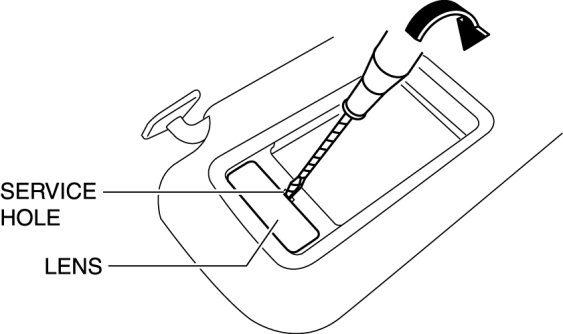 2. Insert a tape-wrapped fastener remover into the service hole, and pry it in the direction indicated by the arrow to remove the lens.