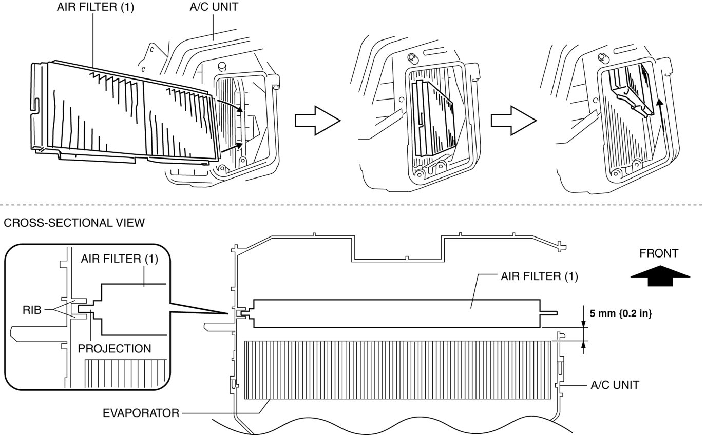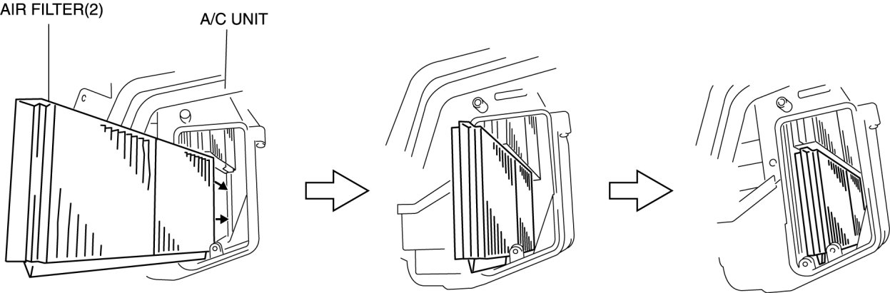 1. Insert the air filter projection between the ribs of the A/C unit and assemble the air filter (1) in the order shown in the figure.