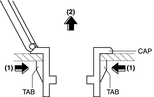 1. Remove the cap in the direction of the arrow (2) shown in the figure while pressing the cap tabs in the direction of the arrow (1).
