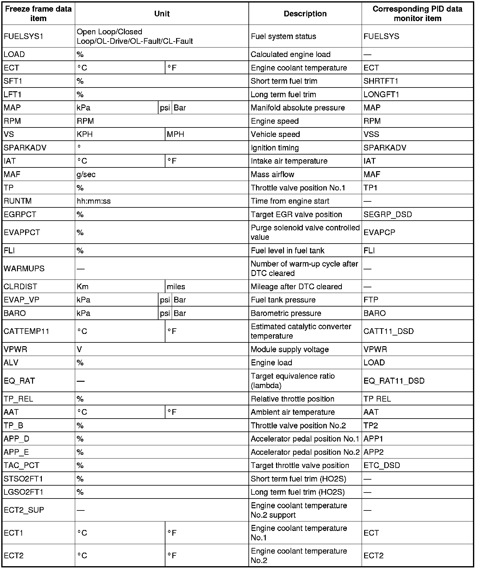 - For the freeze frame data, if there are several malfunctions in the engine control system, the data for the malfunction which occurred initially is stored. Thereafter, if a misfire or fuel injection control malfunction occurs, data from the misfire or fuel injection control malfunction is written over the initially stored data. However, if the initially stored freeze frame data is a misfire or fuel injection control malfunction, it is not overwritten.