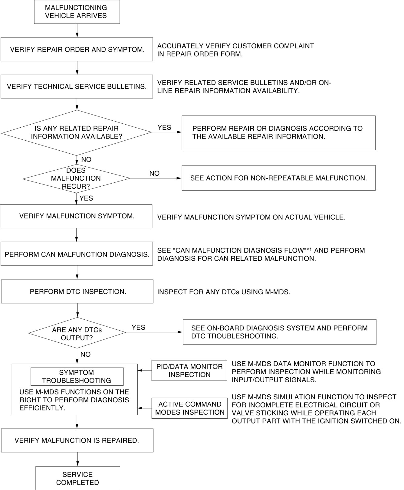 - If there is any vehicle malfunction complaint lodged by a customer, perform malfunction diagnosis according to the troubleshooting procedure.