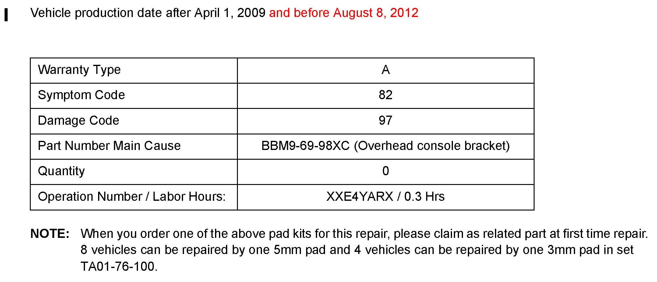 ^ This repair will be covered under Mazda's New Vehicle Limited Warranty term. Additional diagnostic time cannot be claimed for this repair.
