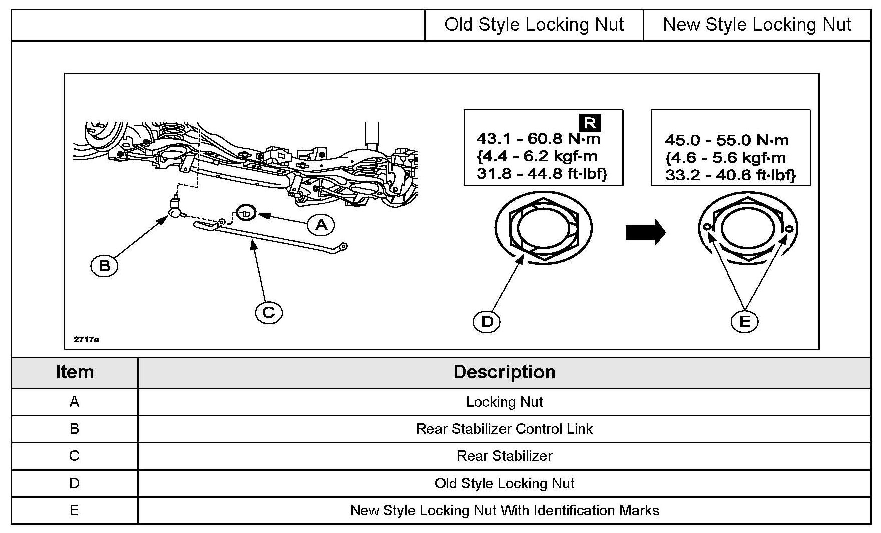 2. Verify the rear stabilizer control link nut torque is below the 31.8 - 44.8 ft-lbf specification.