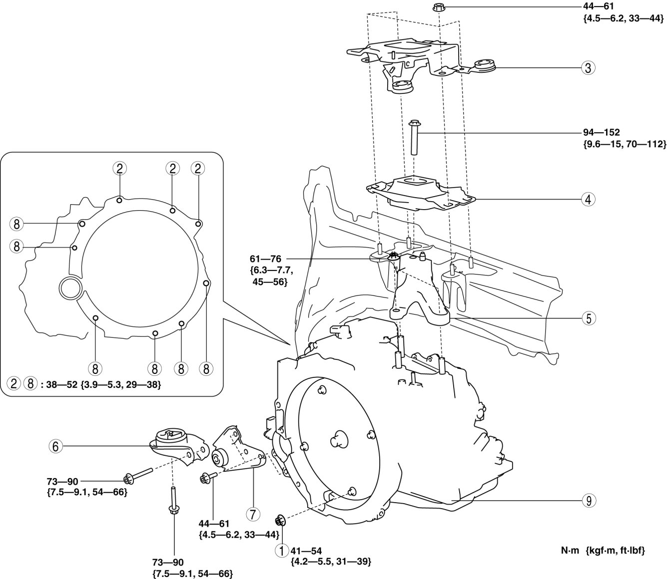 - 94-152 Nm {9.6-15 kgf-m, 70-112 ft-lbf}