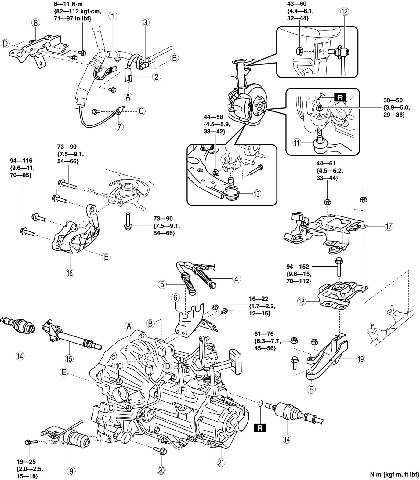 - 94-152 Nm {9.6-15 kgf-m, 70-112 ft-lbf}